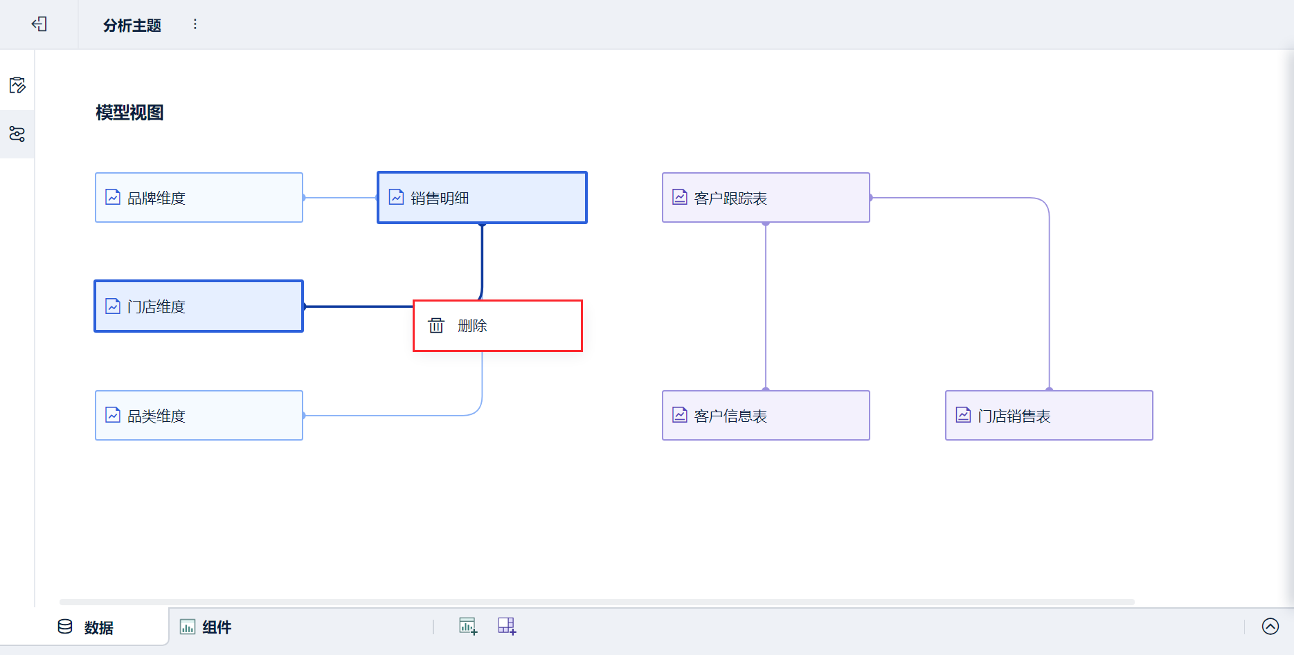 拖拽表到需要配置主题关系的表上,即可生成连线关系,配置模型关系。