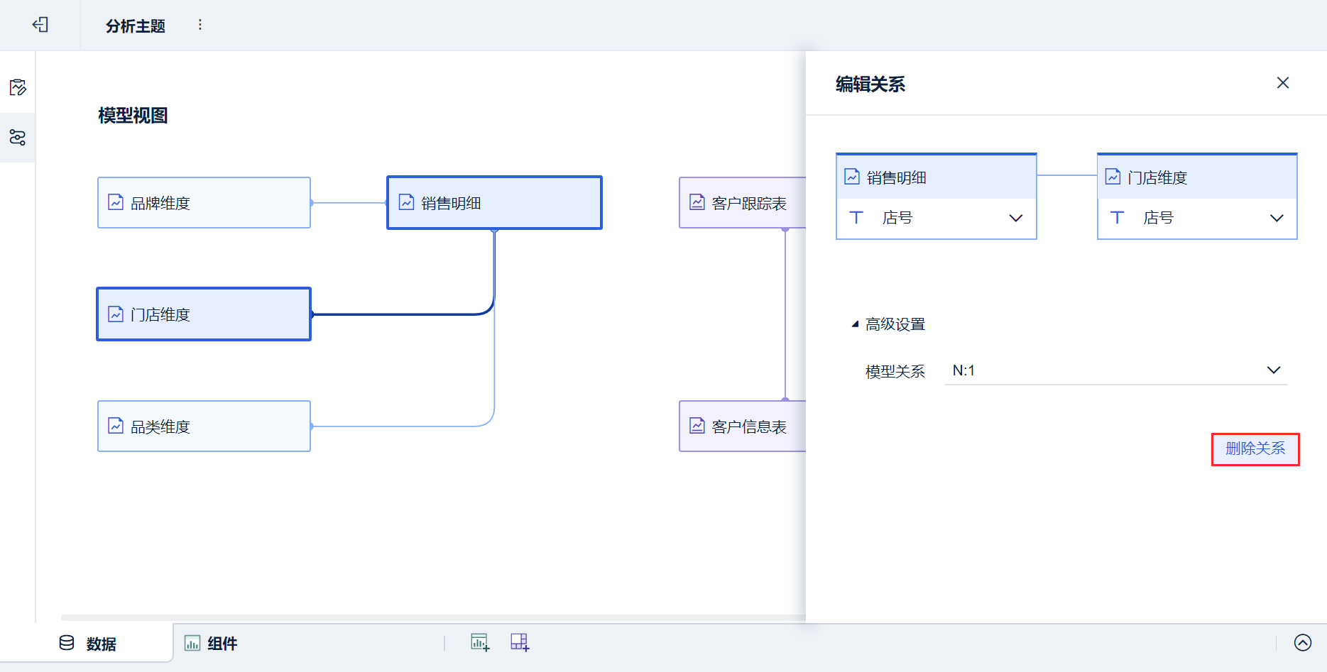 在主题模型中,用户可以对主题内的表配置模型关系,配置后可以在组件中进行多表选字段。