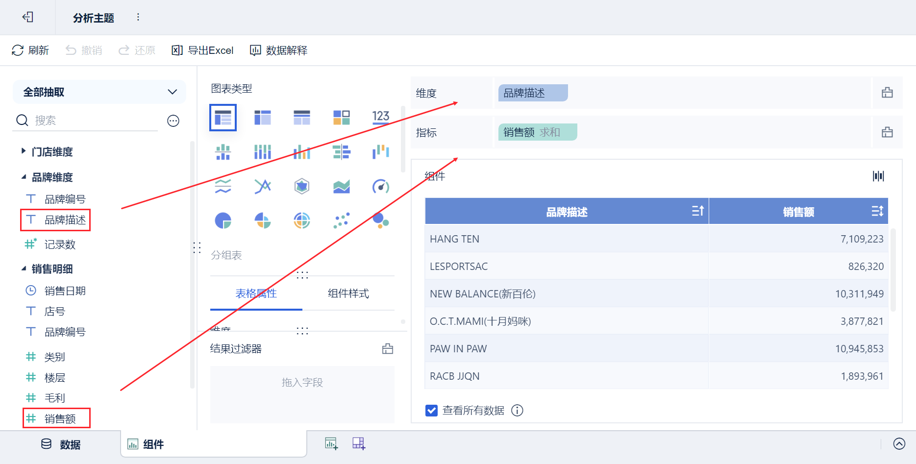 进入到组件后,我们可以将这两张表的字段同时拖入到组件中进行分析,如下图所示: