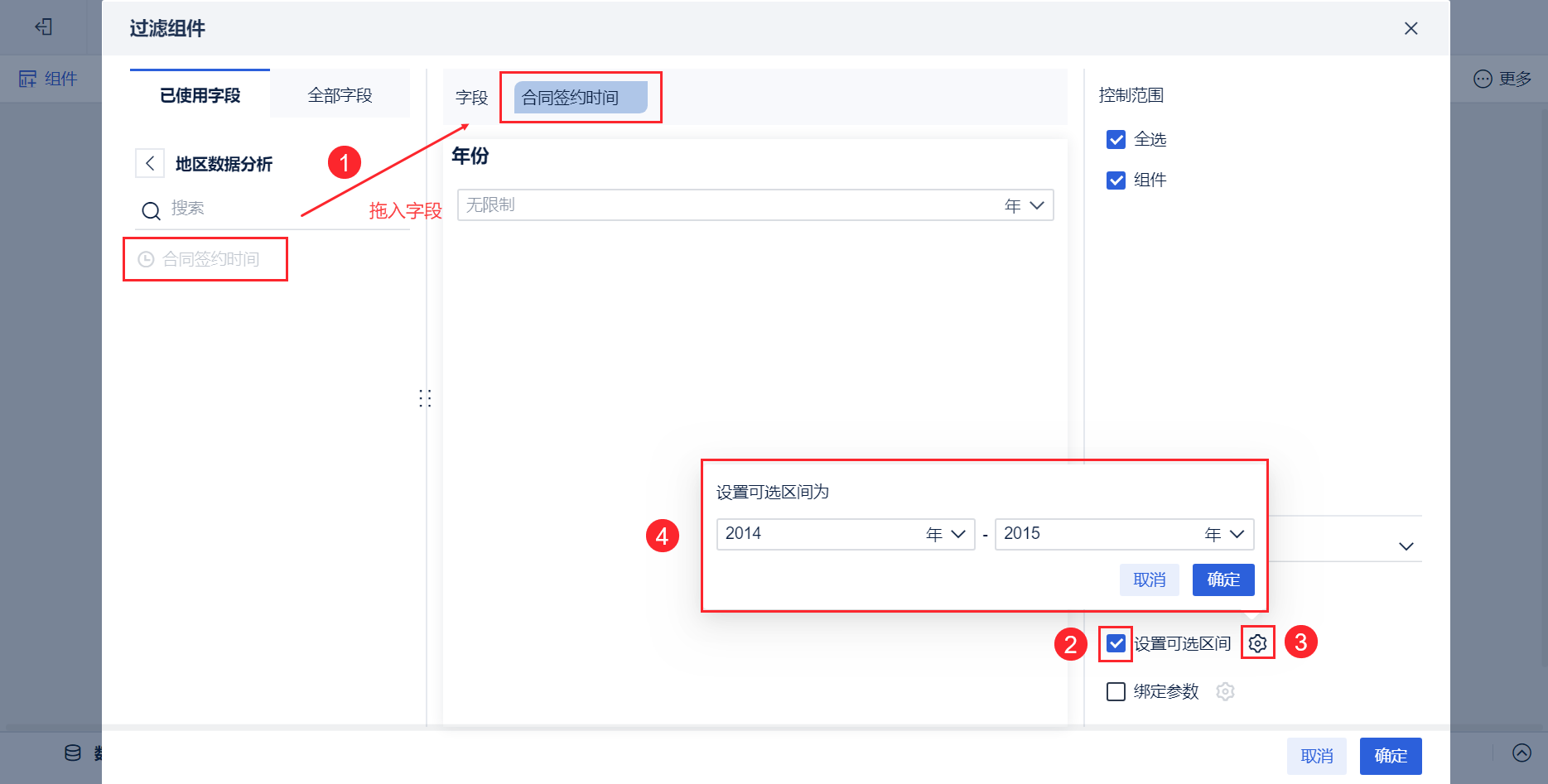 1)进入过滤组件的编辑界面,绑定字段「合同签约时间」,勾选「设置可选区间」为 2014-2015 ,如下图所示: