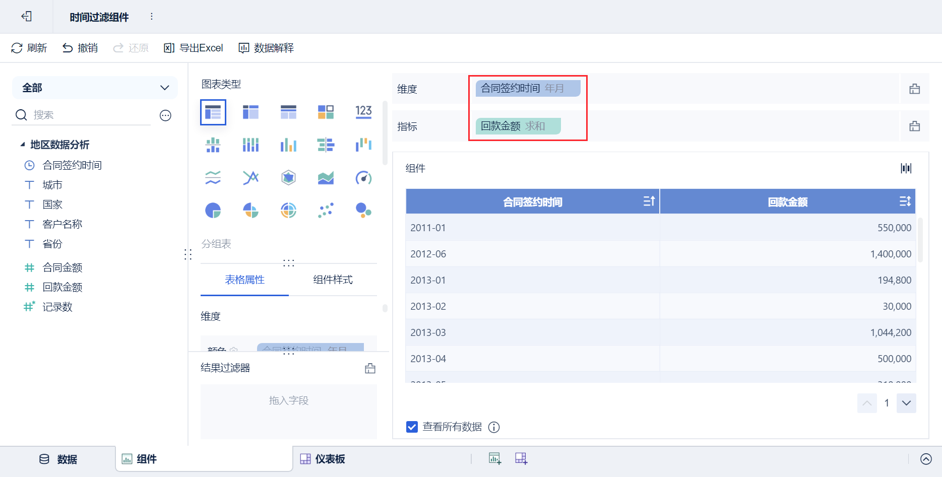 拖入时间过滤组件并绑定「合同事实表」的「合同签约时间」字段