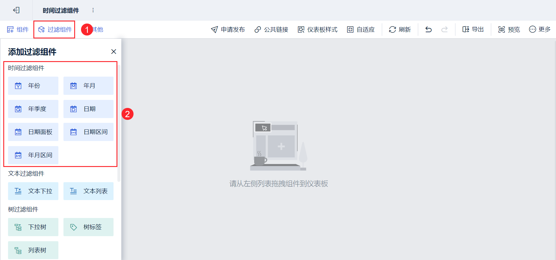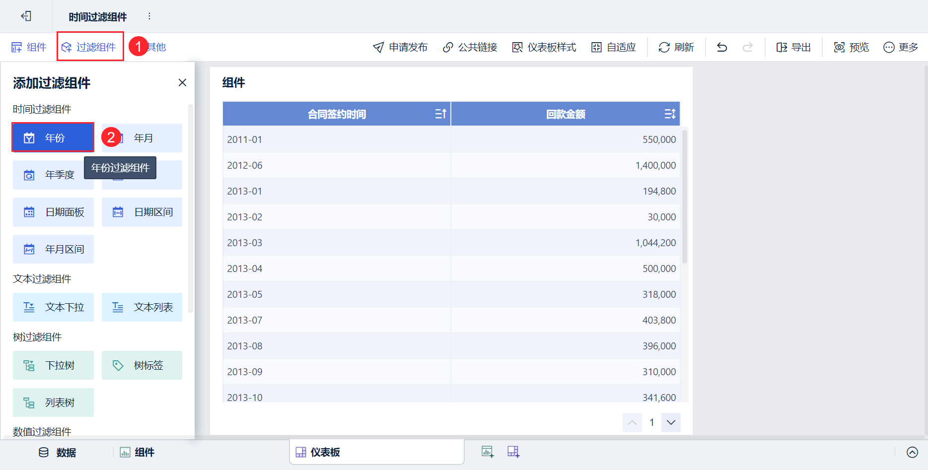 2)添加仪表板,将制作好组件拖入仪表板中,添加「年份过滤组件」,如下图所示: