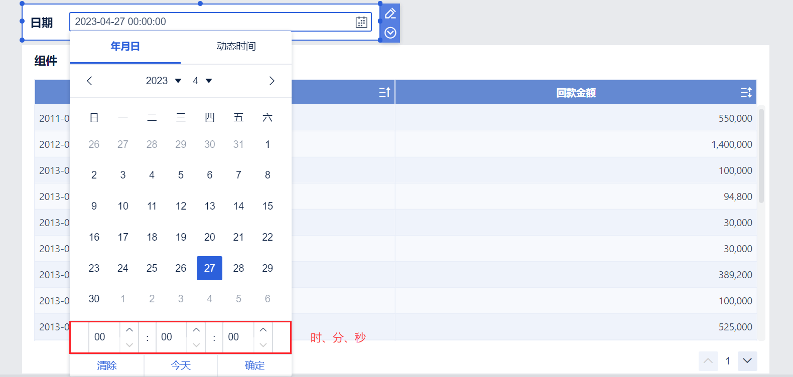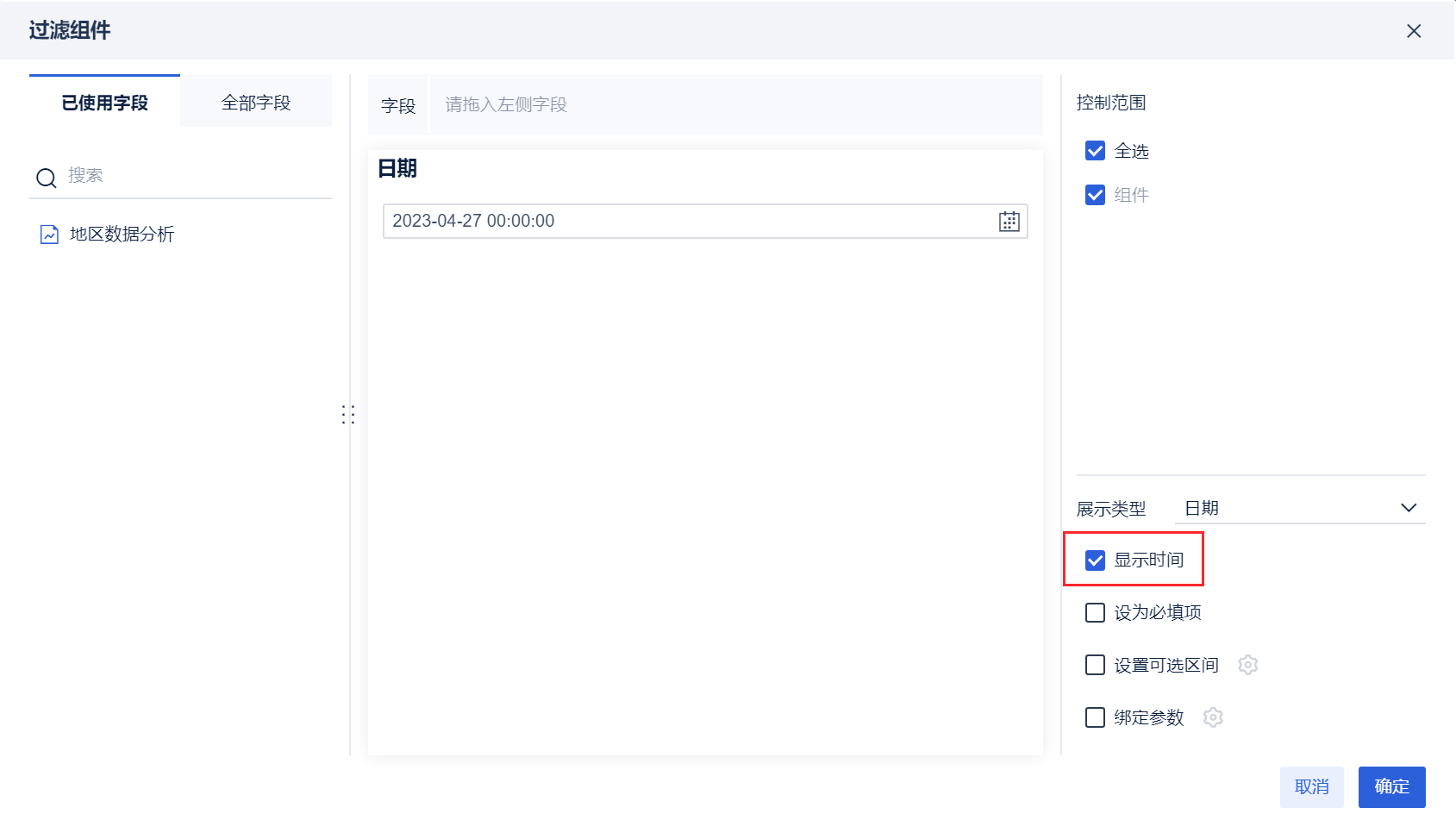 「日期」、「日期面板」和「日期区间」三个过滤组件在过滤组件设置界面可选择「显示时间」,默认不开启。开启后支持设置时、分、秒。