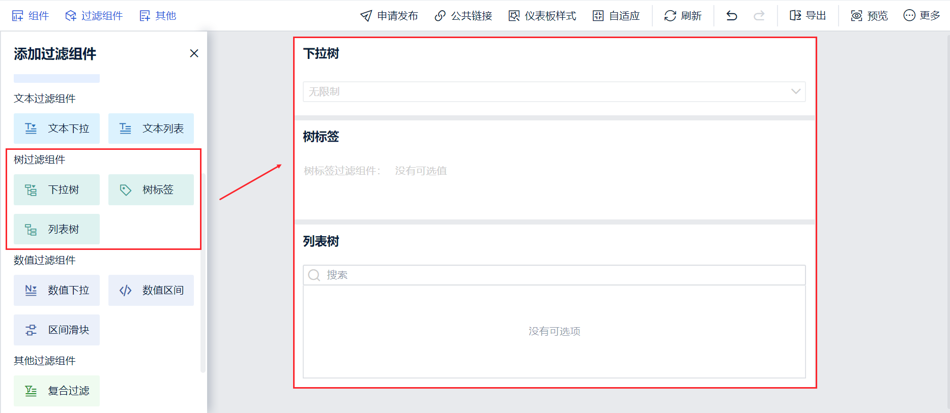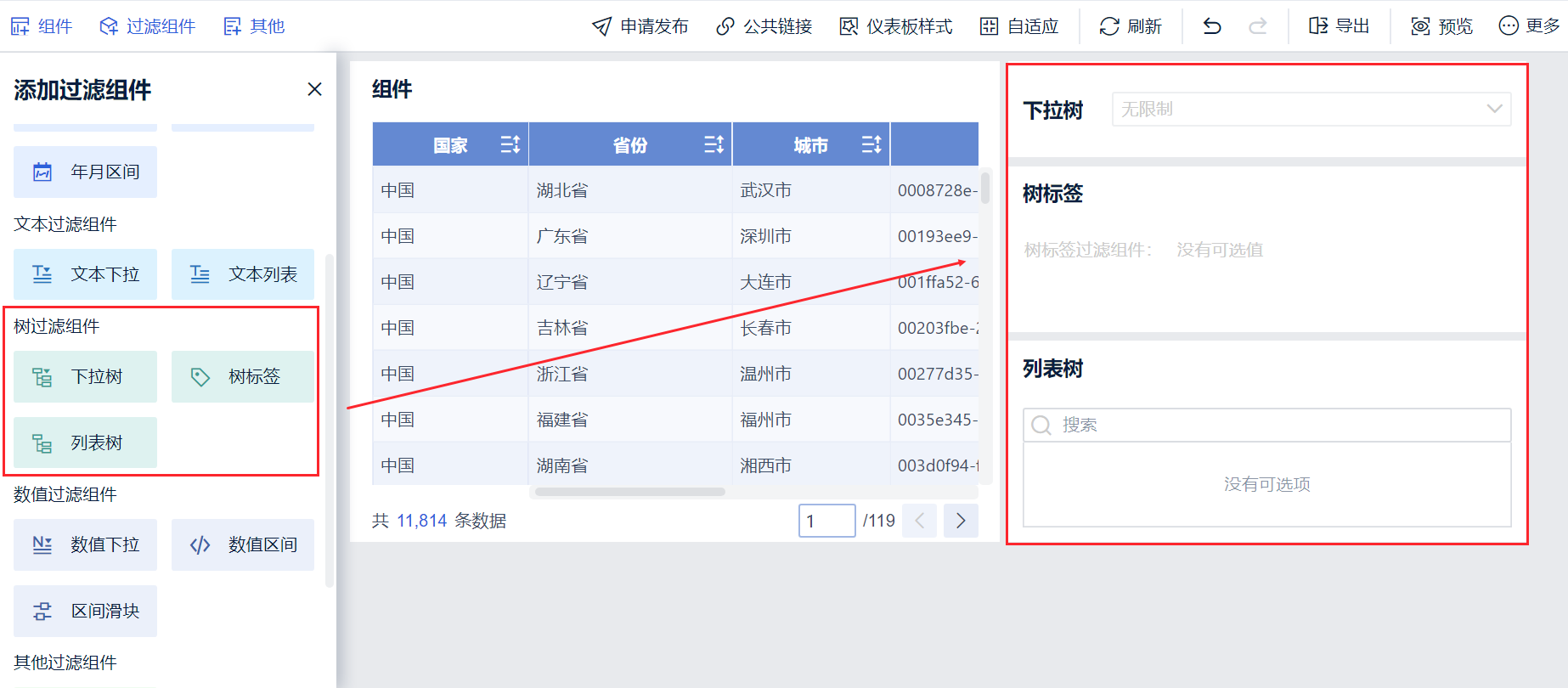 2)添加仪表板,进入到仪表板编辑页面,将制作好的明细表组件拖入仪表板中,选择需要的树过滤组件拖入,如下图所示: