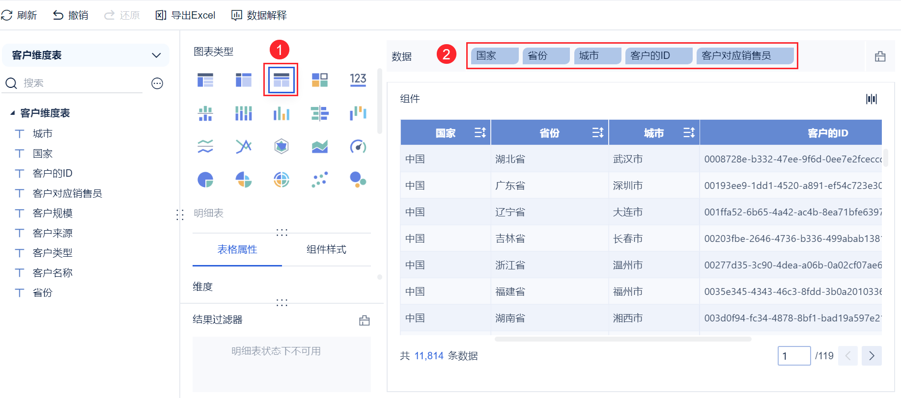 1)新建分析主题,选择 Demo 数据「客户维度表」,新建一个明细表,如图所示: