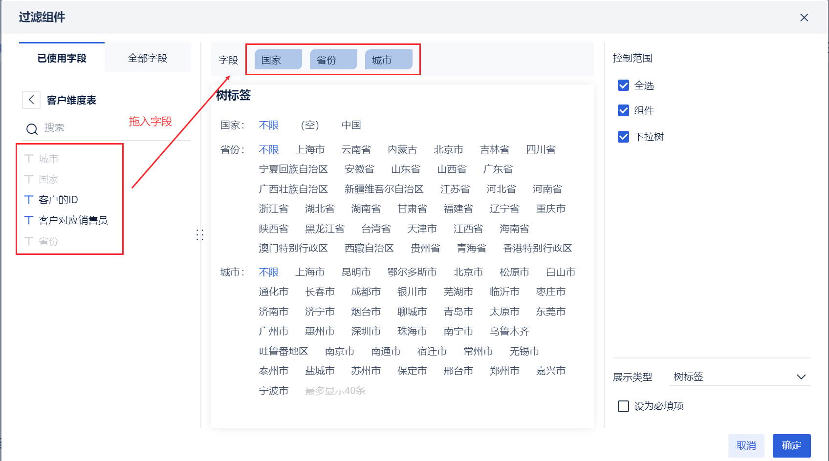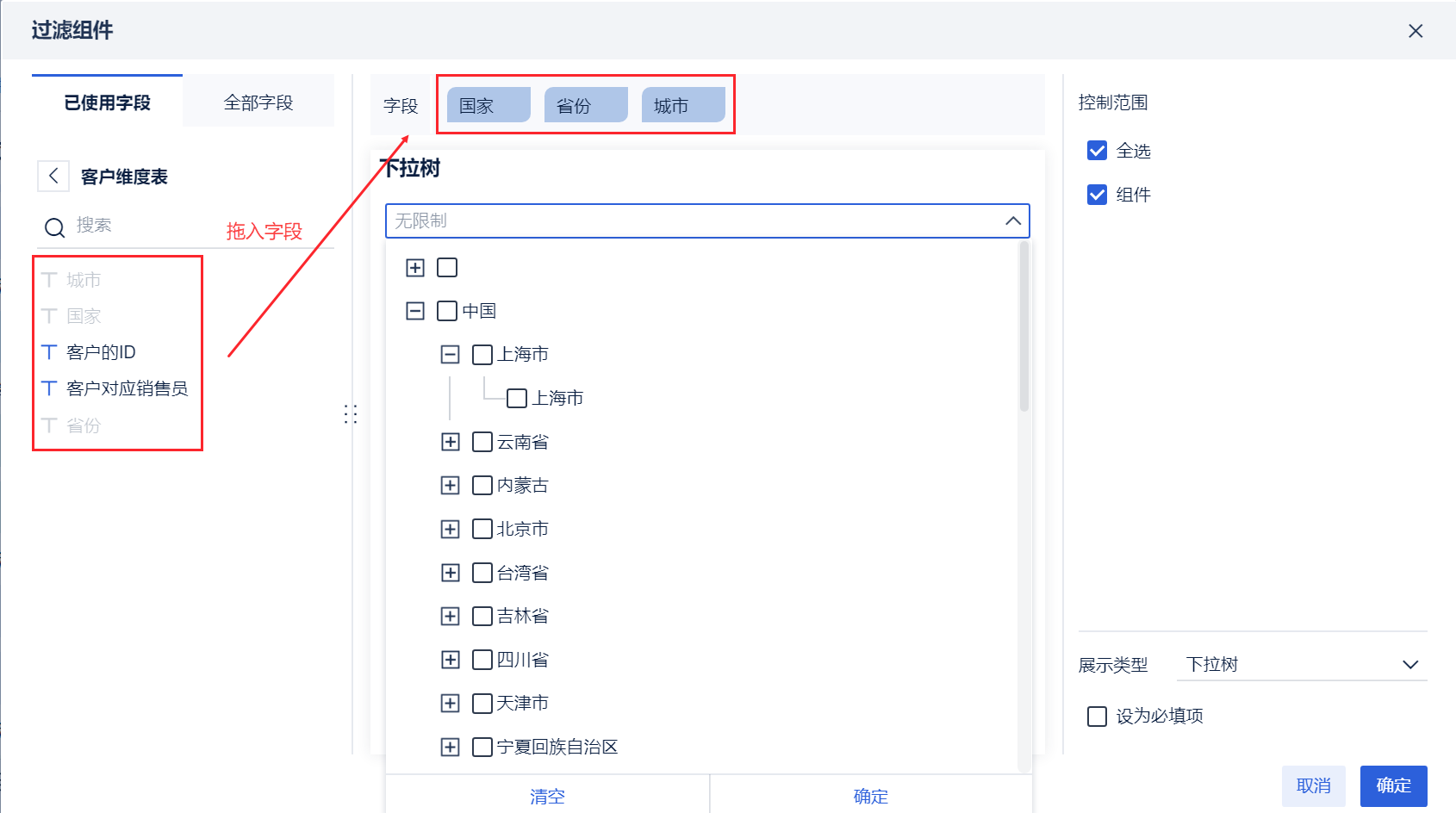 树过滤组件只支持添加一张表的字段,不支持过滤组件控制多个组件,若拖入其他表的字段,之前添加的字段将被清空。