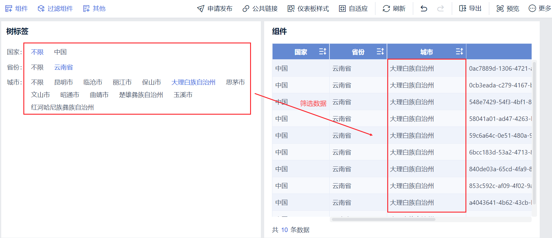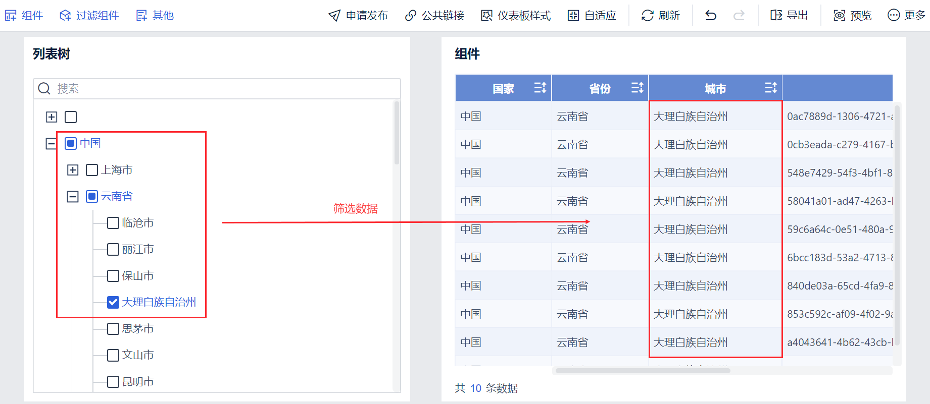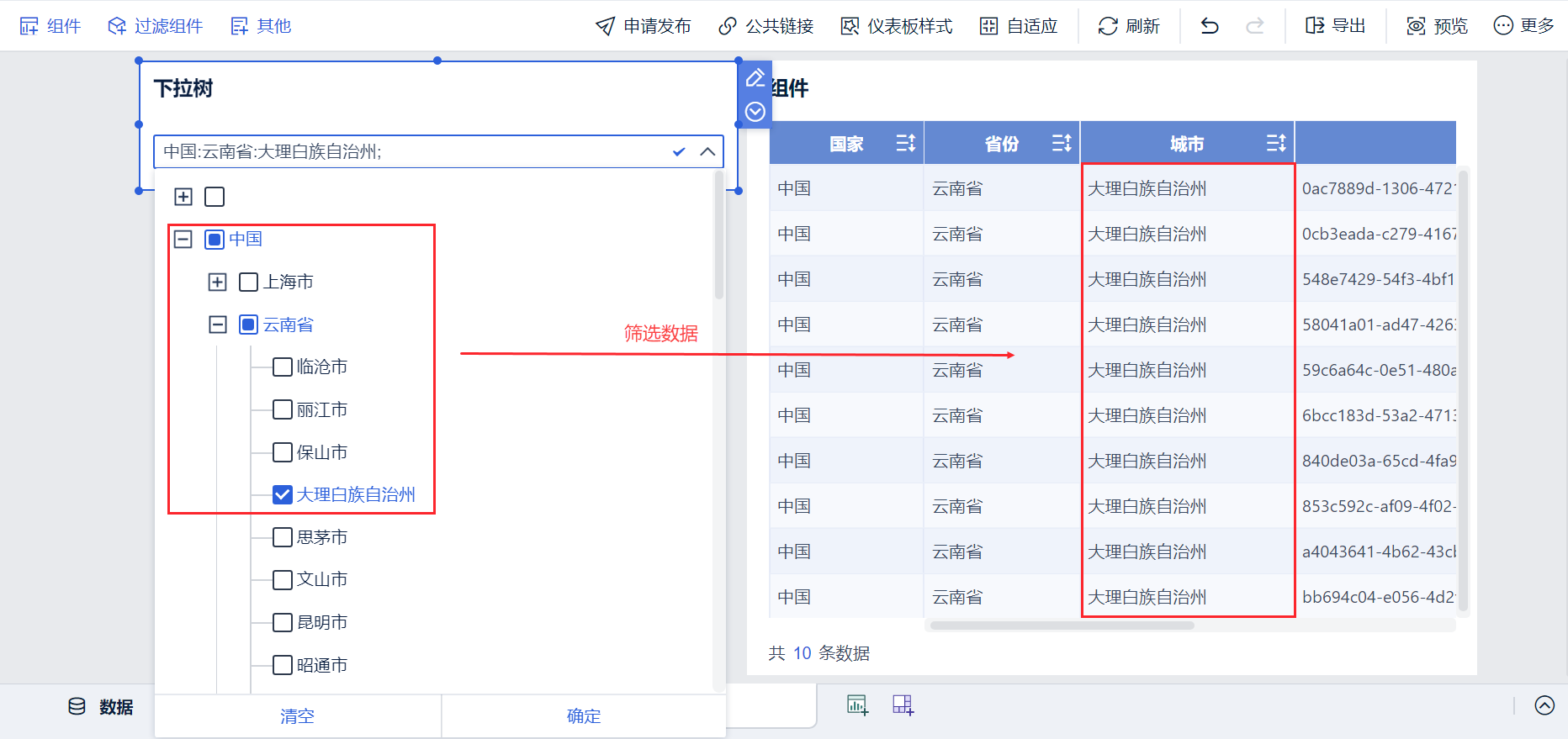 本文介绍如何添加树过滤组件。例如,添加树过滤组件,实现对仪表板上的其他组件的数据进行过滤,筛选出「中国-云南省」的数据。