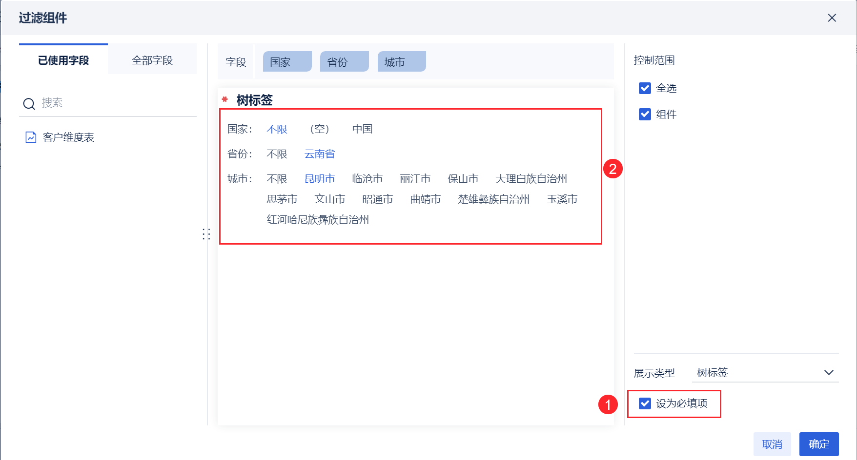 「设为必填项」说明详情参见:过滤组件设为必填项