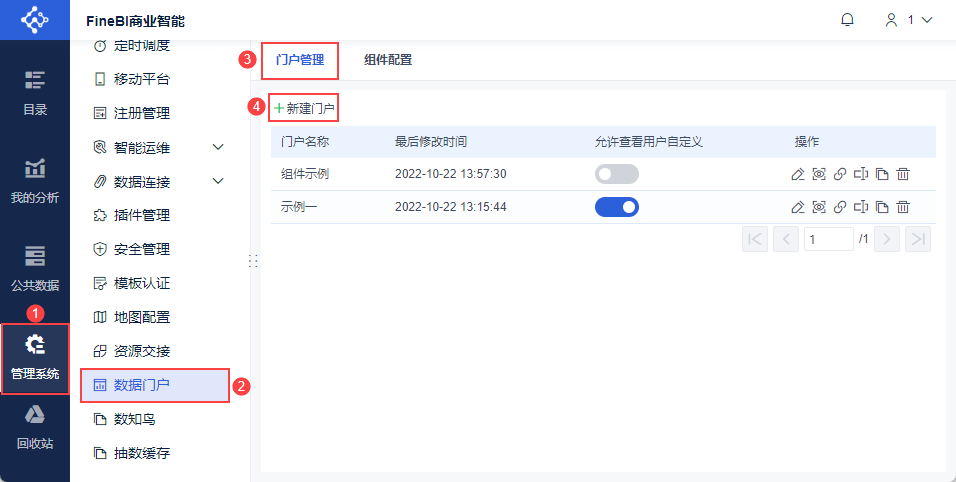 管理员登录FineBI系统,点击「管理系统>数据门户>门户管理」,点击「新建门户」,新建一张数据门户看板,如下图所示: