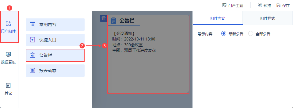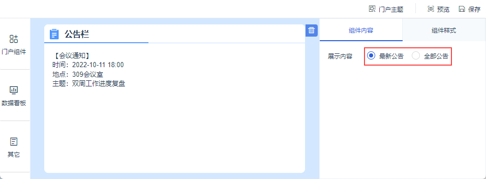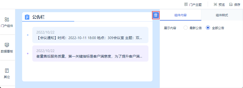 在数据门户编辑界面,选择「门户组件」,点击/拖动「公告栏」组件到数据门户中,如下图所示: