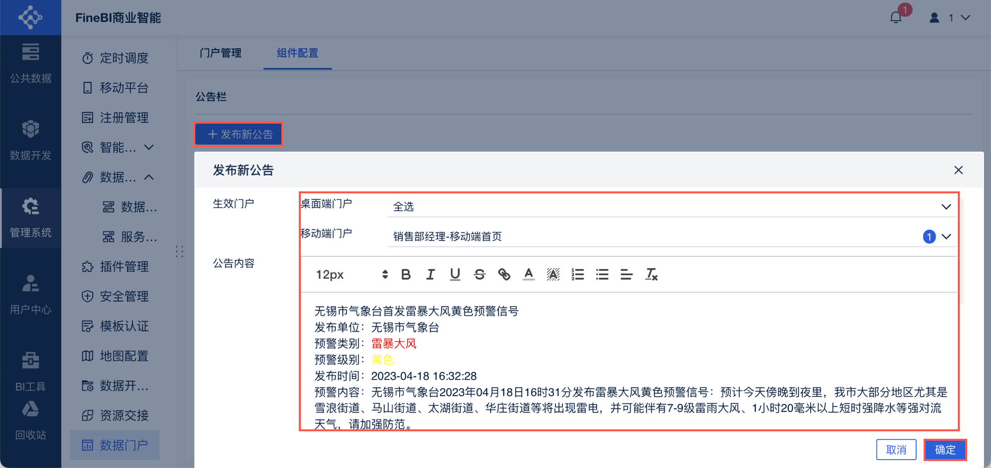 管理员登录FineBI系统,点击「管理系统>数据门户>组件配置」,点击「发布新公告」,选择生效门户,新增一个公告。