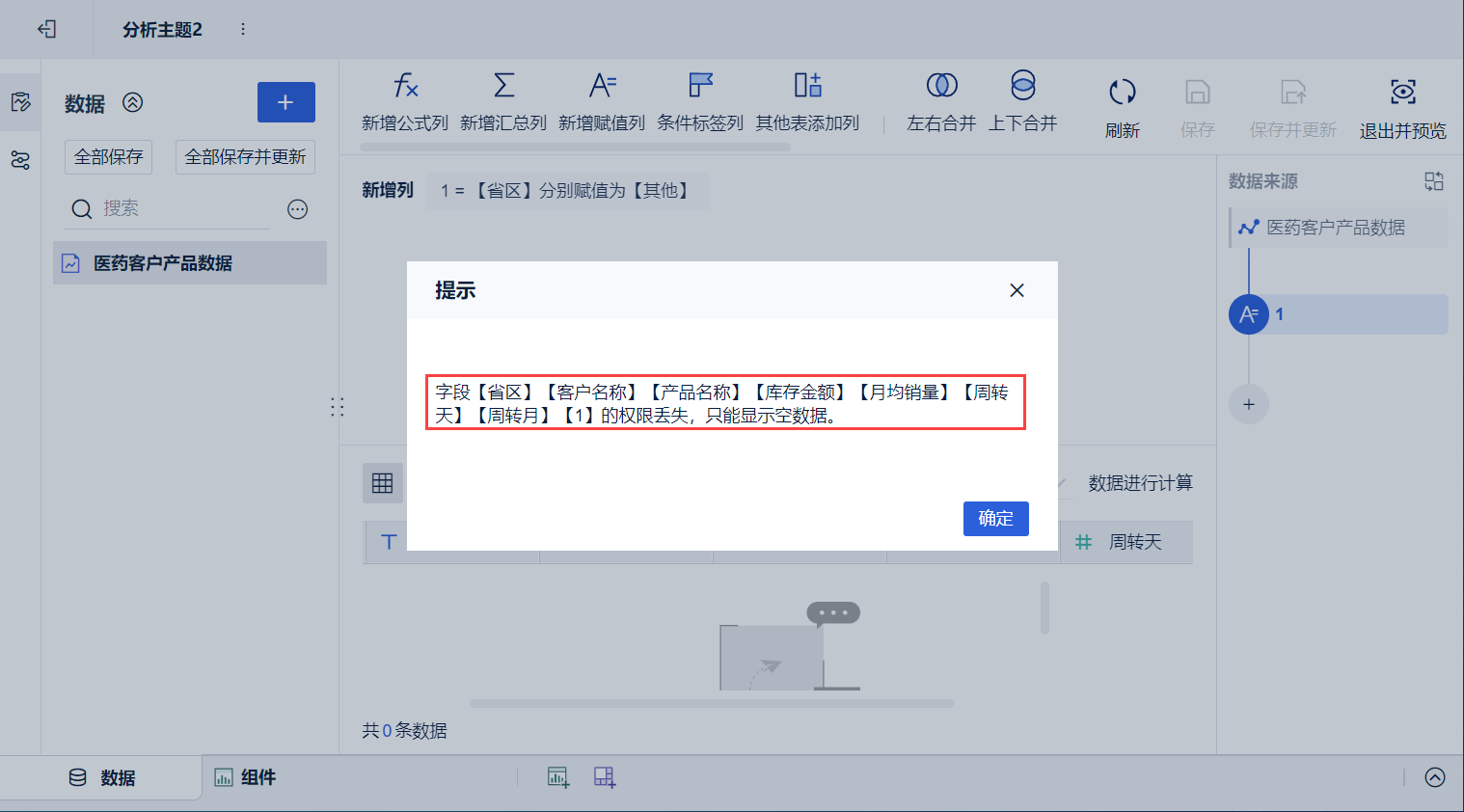 若表的使用权限被收回,在「我的分析」下编辑相关表并保存时,跳出提示「字段XXX的权限丢失,只能显示空数据」。