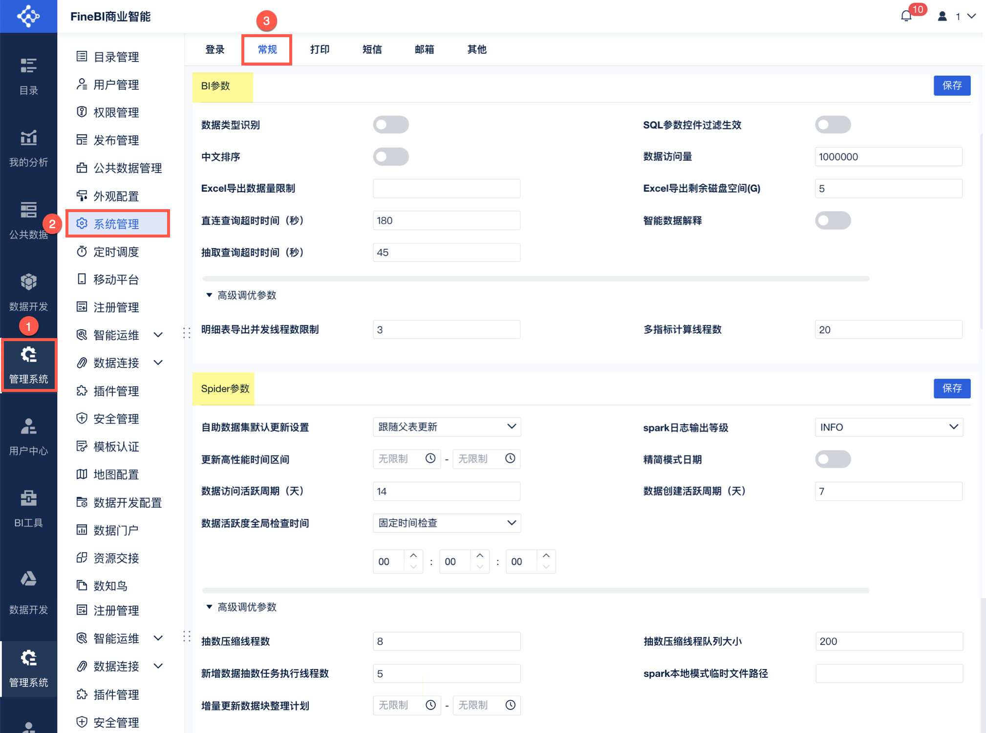 管理员登录FineBI系统,进入「管理系统>系统管理>常规」,可以看到 BI参数和抽取参数配置的页面。如下图所示: