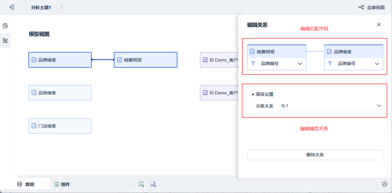 例如:「品牌维度」与「销售明细」中都有「品牌编号」字段,我们对这两张表建立一个模型关系。