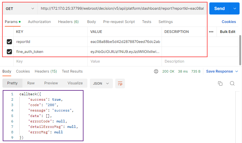 | 请求示例 | 编码前参数值: {"subjectId":"e5c58a91c26143299551ba73d856242f","reportName":"示例仪表板"} 编码后参数值: %7B%22subjectId%22%3A%22e5c58a91c26143299551ba73d856242f%22%2C%22reportName%22%3A%22%E7%A4%BA%E4%BE%8B%E4%BB%AA%E8%A1%A8%E6%9D%BF%22%7D 链接: http://172.17.0.25:37799/webroot/decision/v5/api/platform/dashboard/reports?data=%7B%22subjectId%22%3A%22e5c58a91c26143299551ba73d856242f%22%2C%22reportName%22%3A%22%E7%A4%BA%E4%BE%8B%E4%BB%AA%E8%A1%A8%E6%9D%BF%22%7D&fine_auth_token=xxx 注:使用接口时需要登录,需要传递token参数。 |
