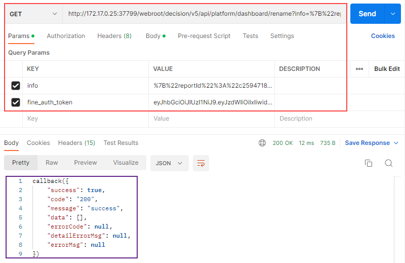 | 请求示例 | 编码前参数值: {"reportId":"c2594718581f493f951f055b0f3122f6","nameUpdateBean":{"name": "新手入门示例","mouduleType": "2"}} 编码后参数值: %7B%22reportId%22%3A%22c2594718581f493f951f055b0f3122f6%22%2C%22nameUpdateBean%22%3A%7B%22name%22%3A%22%E6%96%B0%E6%89%8B%E5%85%A5%E9%97%A8%E7%A4%BA%E4%BE%8B%22%2C%22mouduleType%22%3A%222%22%7D%7D 链接: http://172.17.0.25:37799/webroot/decision/v5/api/platform/dashboard/rename?info=%7B%22reportId%22%3A%22c2594718581f493f951f055b0f3122f6%22%2C%22nameUpdateBean%22%3A%7B%22name%22%3A%22%E6%96%B0%E6%89%8B%E5%85%A5%E9%97%A8%E7%A4%BA%E4%BE%8B%22%2C%22mouduleType%22%3A%222%22%7D%7D&fine_auth_token=xxx 注:使用接口时需要登录,需要传递token参数。 |