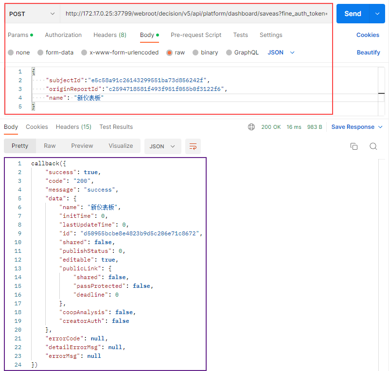 | 请求链接 | http://172.17.0.25:37799/webroot/decision/v5/api/platform/dashboard/saveas?fine_auth_token=xxx 注:使用接口时需要登录,需要传递token参数。 |