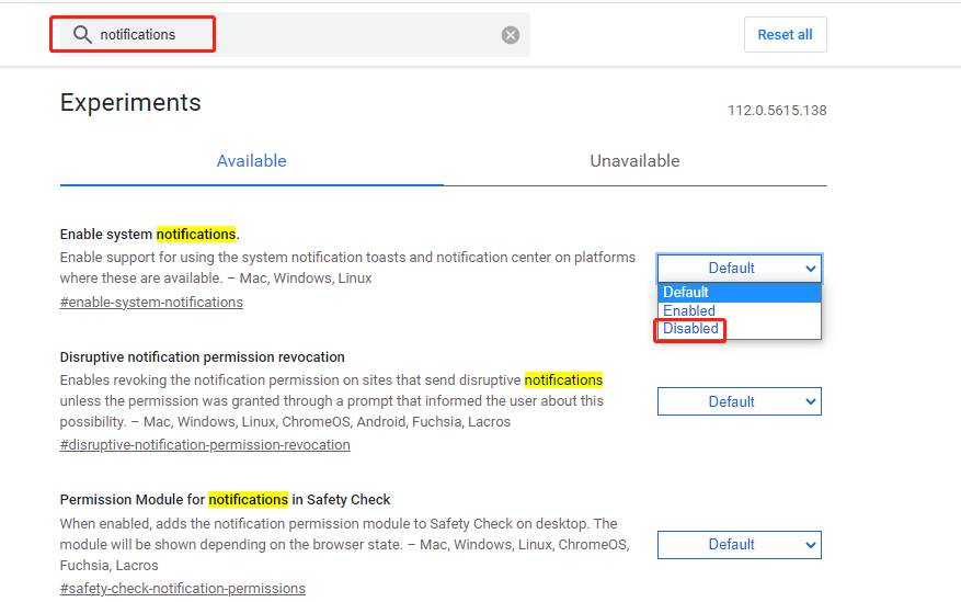 ii.在搜索栏中搜索「notifications」,找到「Enable system notifications」选项,将其选项值改为「Disabled」,重启浏览器即可。