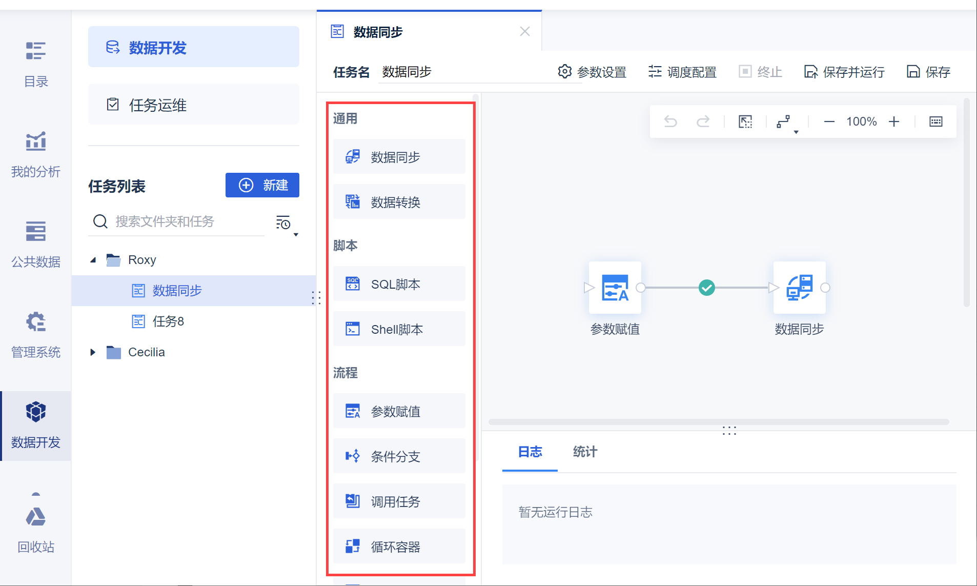 节点是组成定时任务的基本单位,多个节点通过线条连接后可确定执行流程,进而组成一个完整的 ETL 任务,如下图则为进入数据开发后的任务节点界面: