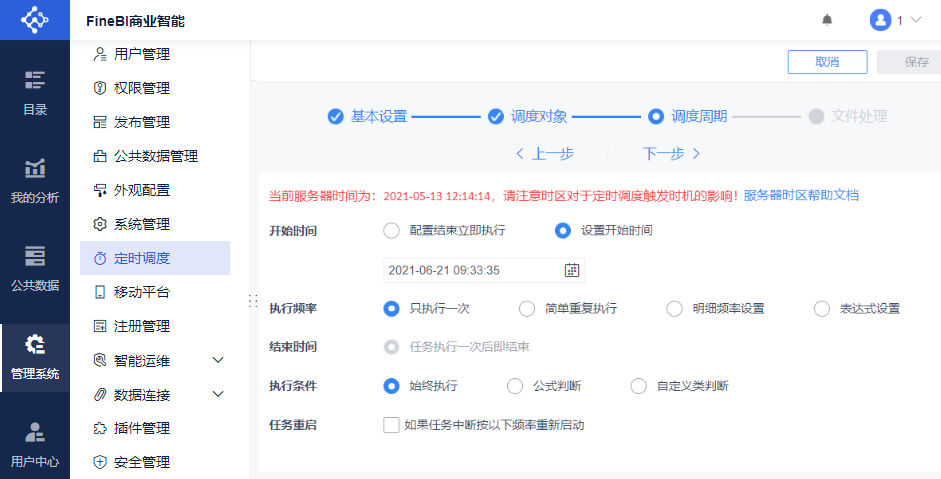 若FineBI工程服务器的时区和浏览器的时区不一致,出现提示:当前服务器时间为XXX,请注意时区对于定时调度触发时机的影响!如下图所示: