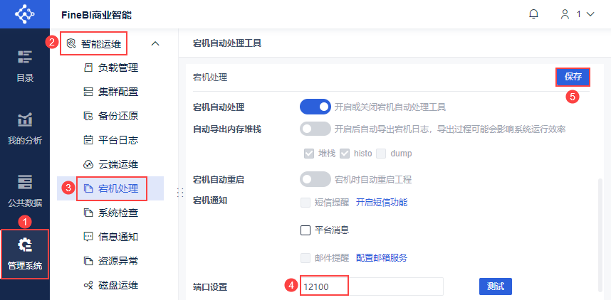 4)针对宕机场景,帆软提供应用存活监控功能,管理员登录数据决策系统,点击「管理系统>智能运维>宕机处理」。