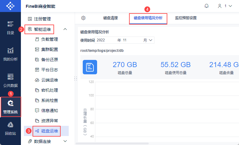 帆软提供磁盘运维功能,点击「管理系统>智能运维>磁盘运维」,其中「磁盘使用情况分析」Tab提供相应功能。