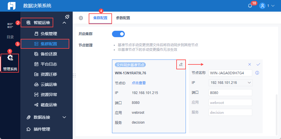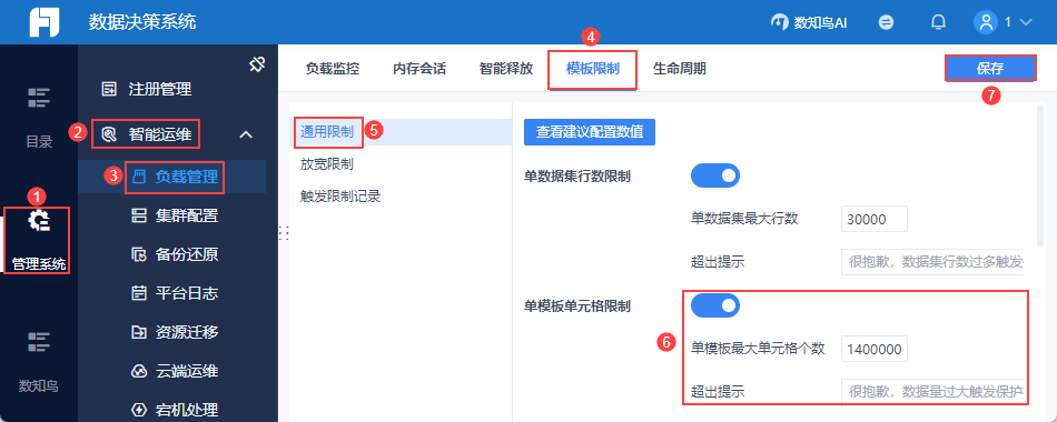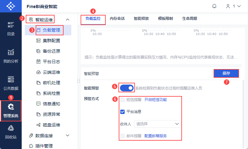 管理员登录数据决策系统,点击「管理系统>智能运维>负载管理」,其中「负载监控」内可进行智能预警配置。