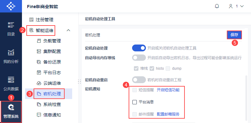 管理员登录数据决策系统,点击「管理系统>智能运维>宕机处理」,其中「宕机处理」内可进行宕机通知配置。