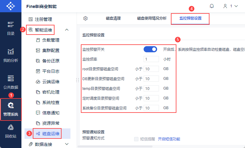 管理员登录数据决策系统,点击「管理系统>智能运维>磁盘运维」,其中「磁盘预警设置」tab页内可进行磁盘预警配置。