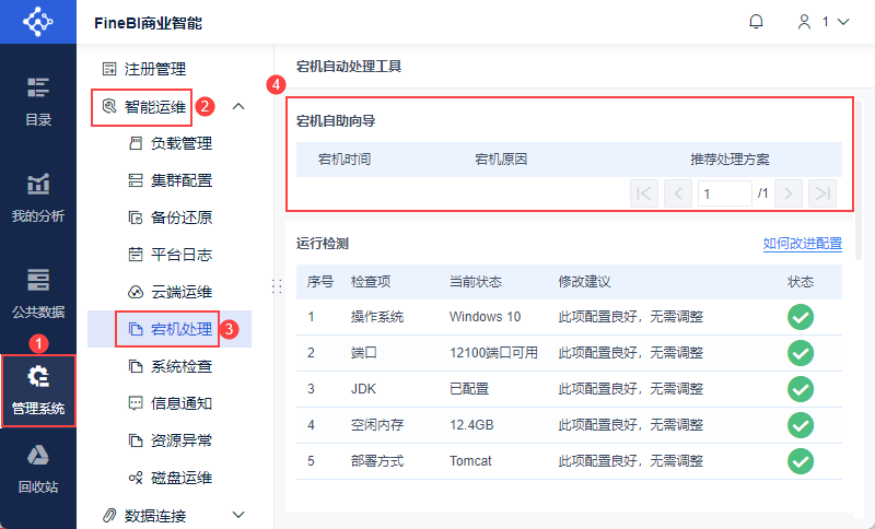 5)针对宕机定位,帆软提供宕机自助处理功能,管理员登录数据决策系统,点击「管理系统>智能运维>宕机处理」。
