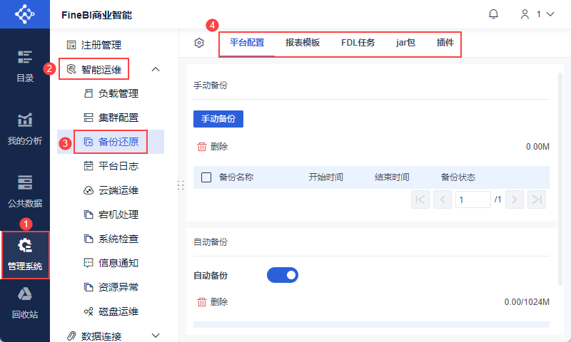 帆软平台提供备份还原的功能,支持对「平台配置」、「报表模板」、「BI模板」、「JAR 包」、「插件」进行备份还原。