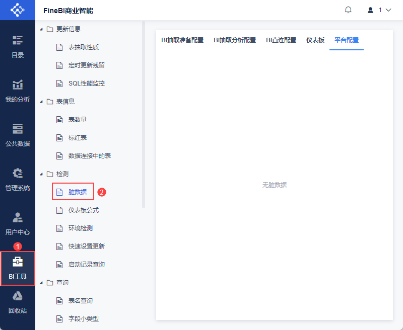 | 配置检查 | 包括:外接数据库编码、Nginx健康检查、Nginx参数配置、集群参数配置、更新资源无限制时间段配置、二级缓存开启情况、SQL执行时长限制、单模板单元格数限制、导入excel单元格数限制、单数据集行数限制、负载预警开启、脏数据检测 | ||
