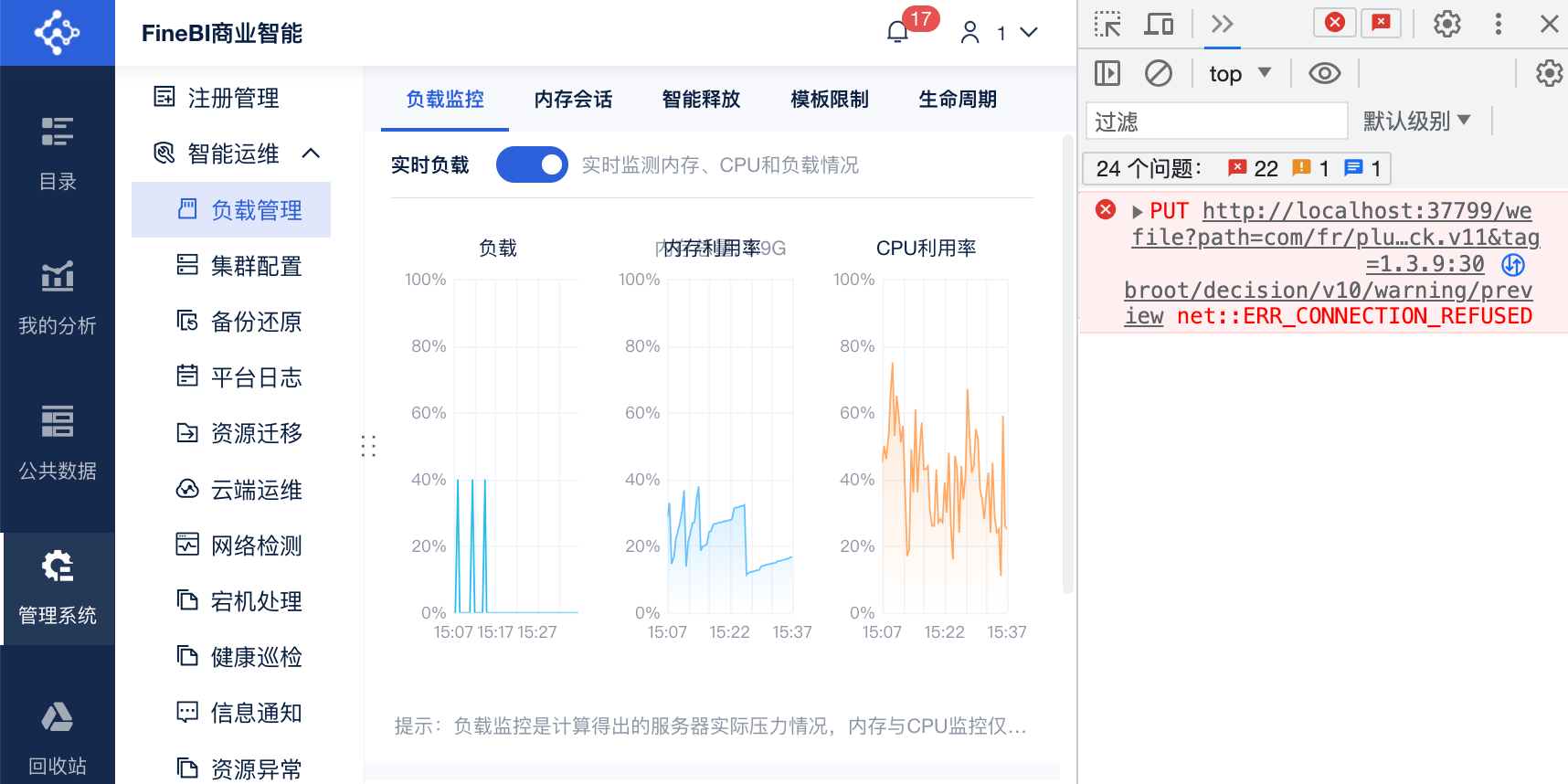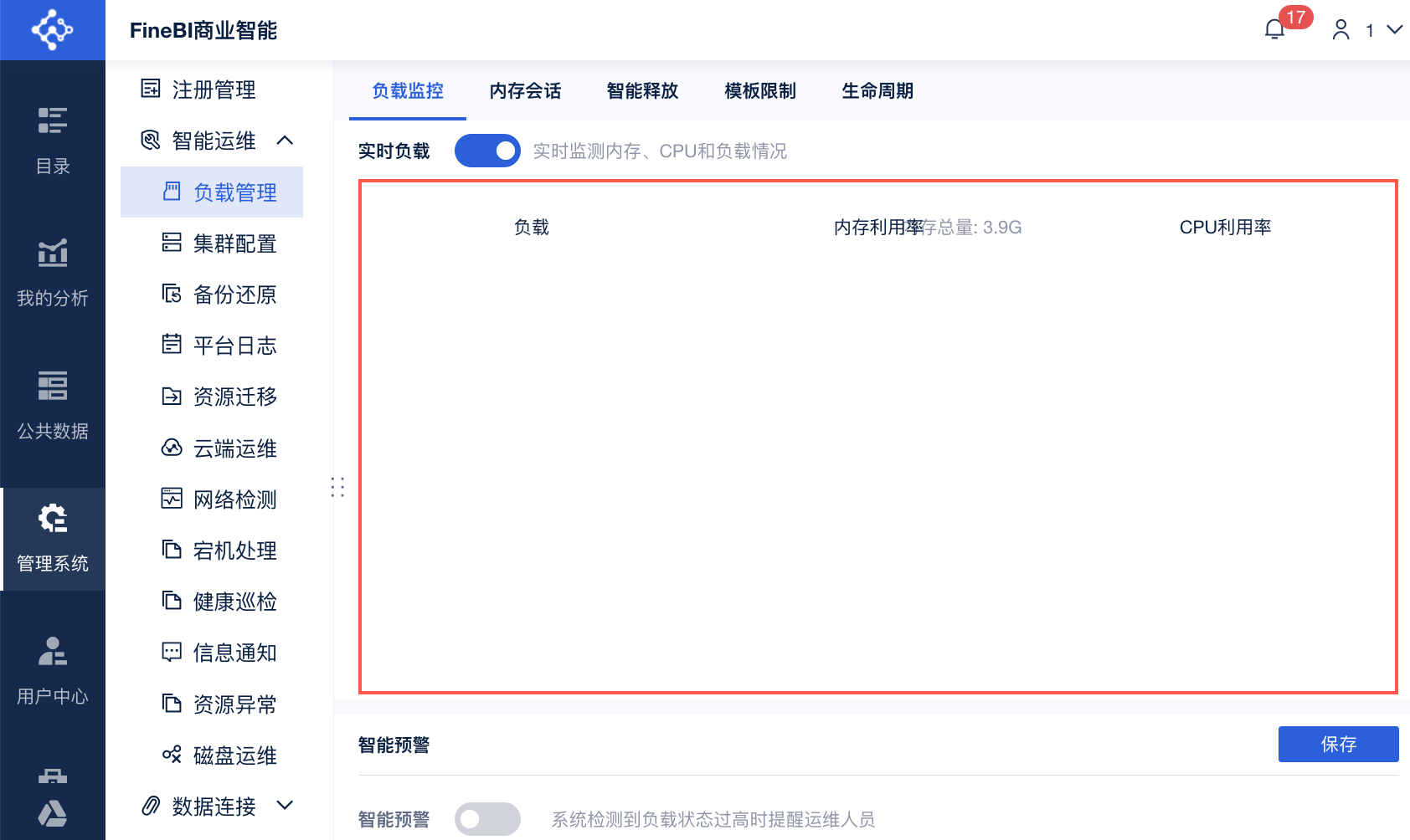 1)管理员登录 FineBI 系统,点击「管理系统>智能运维>负载管理」,「负载监控」Tab 下「负载」、「内存利用率」和「CPU 利用率」这三张图显示空白。