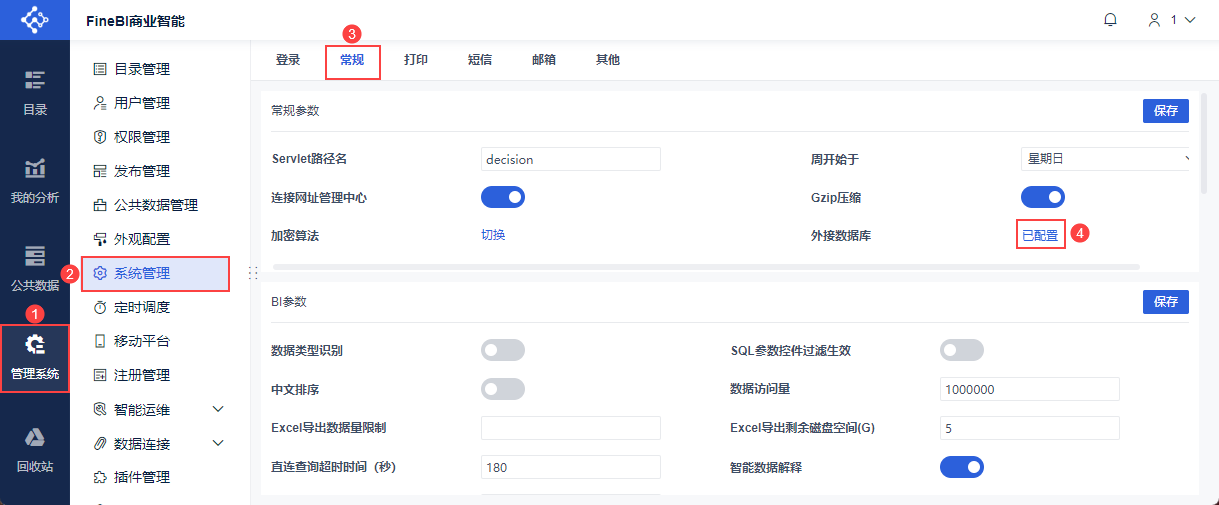 管理员登录数据决策系统,点击「管理系统>系统管理>常规>外接数据库」,确保系统已配置外接数据库。