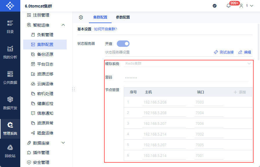 管理员登录数据决策系统,点击「管理系统>智能运维>集群配置」。