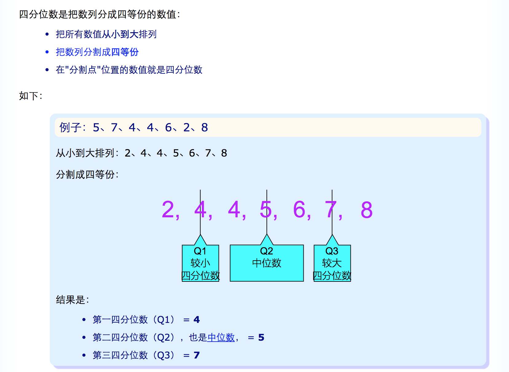 有关箱形图 Q1、Q2、Q3 这三个指标的介绍和计算方法,详情参见统计学概念 四分位数