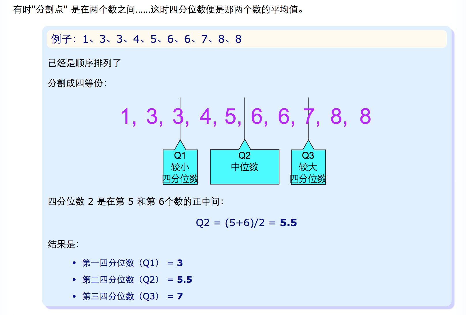 上下四分位数:上四分位数的位置计算有争议,我们采用最通行的计算方法。
