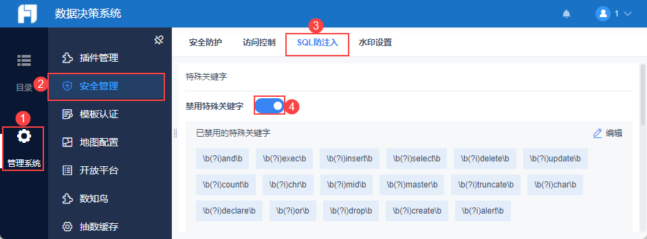操作:管理员登录数据决策系统,点击「管理系统>安全管理>SQL防注入」,默认开启。