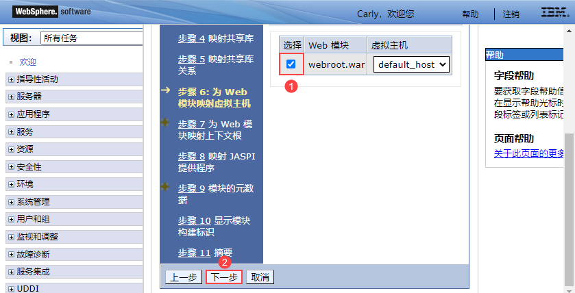 步骤 6: 为 Web 模块映射虚拟主机:勾选「复选框」,进入「下一步」。