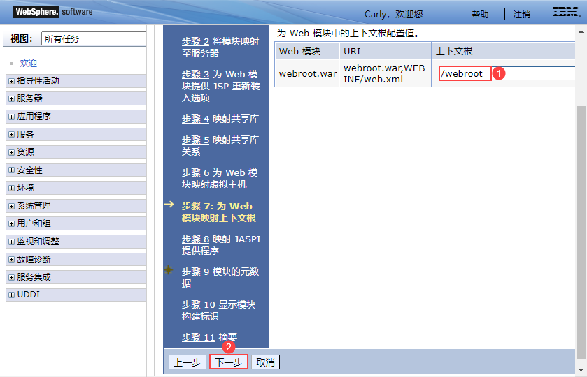 步骤 7: 为 Web 模块映射上下文根:将上下文根改为工程名,进入「下一步」。