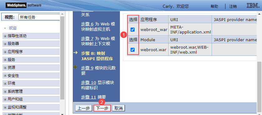 步骤 8: 映射 JASPI 提供程序:勾选全部「复选框」,进入「下一步」。