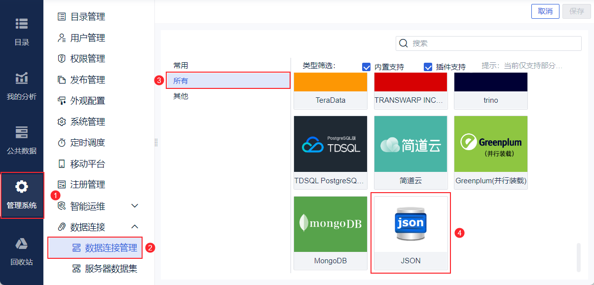 1)以管理员身份进入数据决策系统,点击「管理系统>数据连接>数据连接管理>新建数据连接>所有」,可添加 JSON 数据连接,如下图所示:
