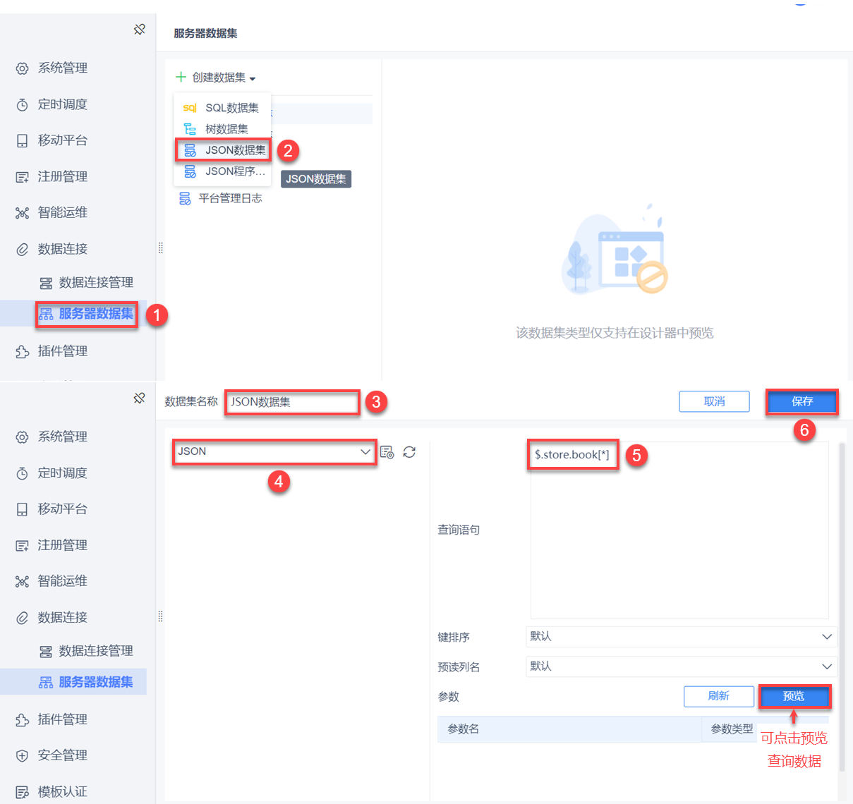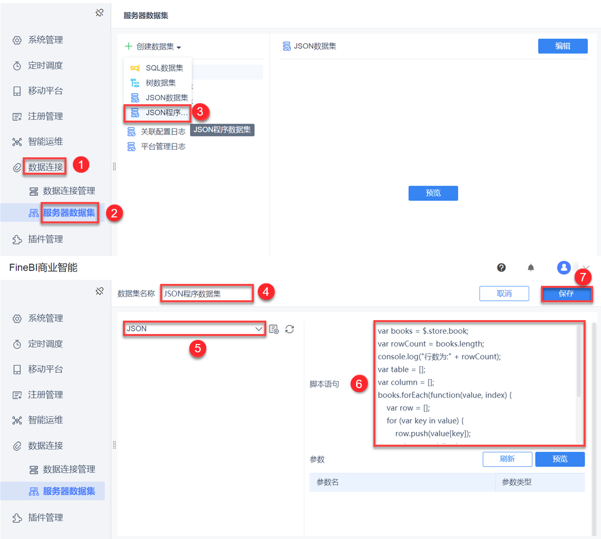 以管理员身份进入数据决策系统,点击「管理系统>数据连接>服务器数据集>JSON程序数据集」,数据集名称为「JSON程序数据集」,选择创建的 JSON 数据连接,输入脚本语句,点击「保存」按钮即可。如下图所示: