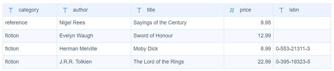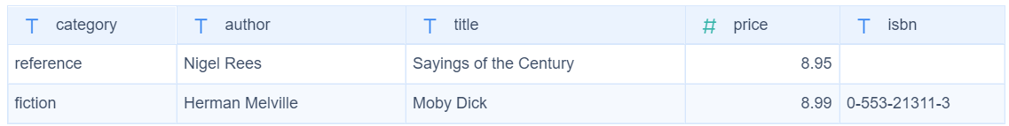 | 查询语句 | 输入查询语句 | $.store.book[*] 查询出书店中所有的书信息,查询结果如下图所示: