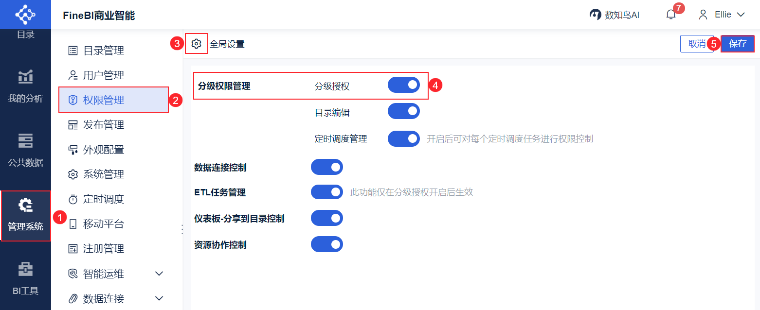 2)普通用户查看轻应用,需要管理员在「权限管理>全局设置」开启「分级授权」。如下图所示: