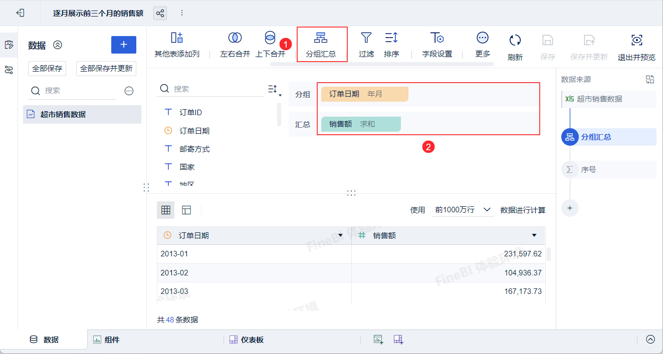 点击「新增汇总列」,对订单日期进行升序排名,如下图所示: