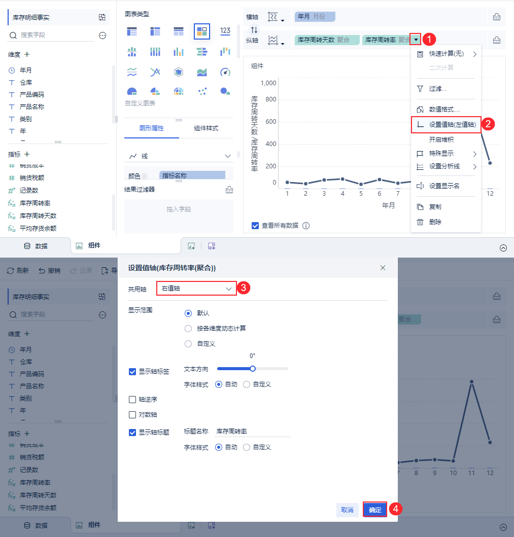 将「年月」字段拖入横轴,将「库存周转天数」和「库存周转率」字段拖入纵轴,选择「自定义图表」图表类型,并设置图形属性,「库存周转天数」为「柱形图」,「库存周转率」为「折线图」,如下图所示: