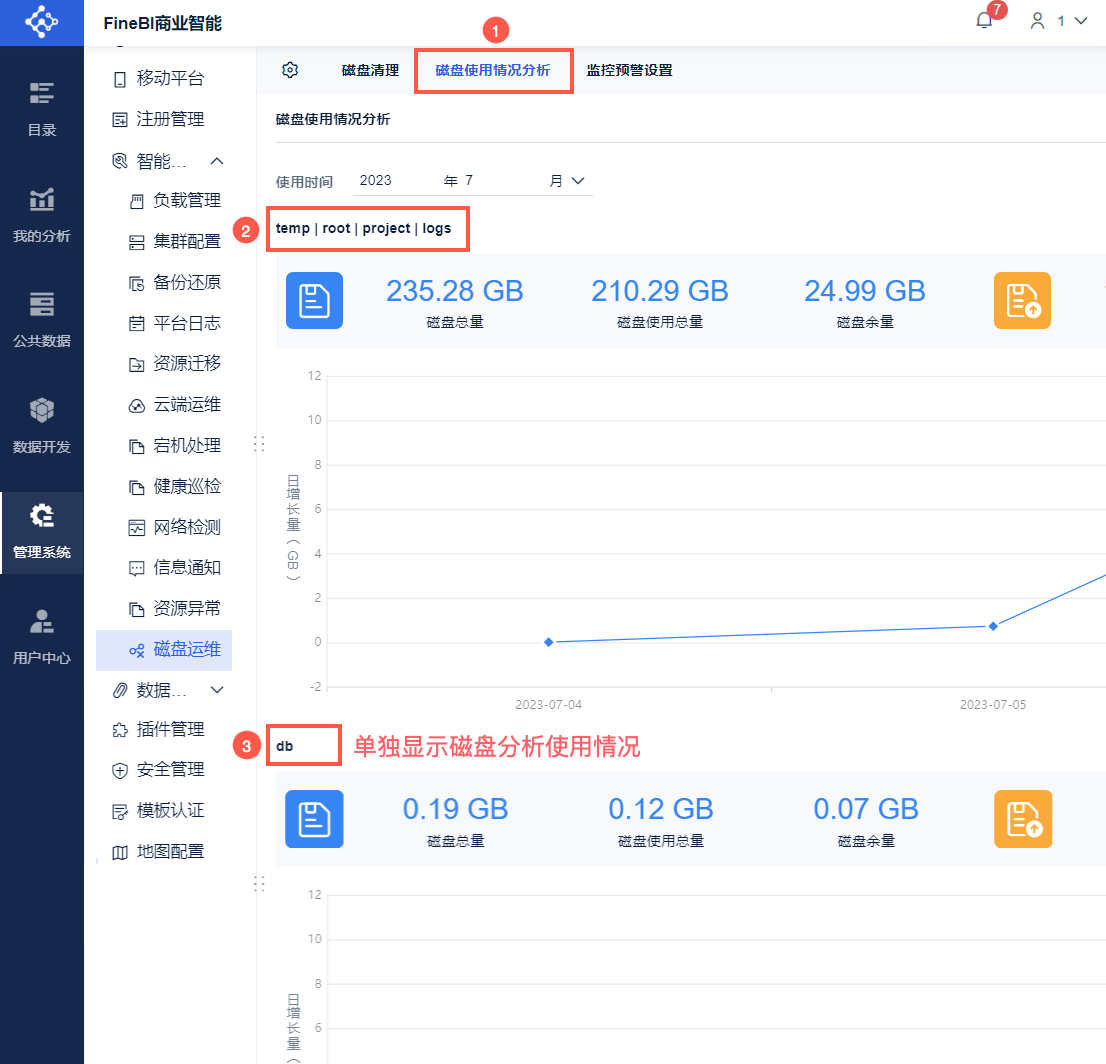 管理员登录FineBI系统,点击「管理系统>智能运维>磁盘运维」。