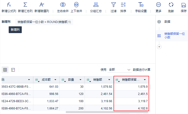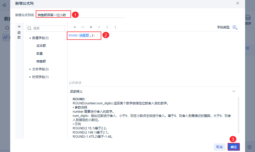 在主题中使用 新增列 ,点击「新增公式列」,「新增公式列名」设为“销售额保留一位小数”,命名后输入公式ROUND(销售额,1),点击「确定」,如下图所示: