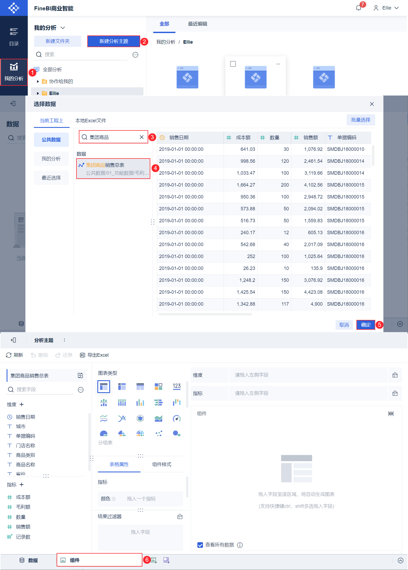 新建分析主题,上传下载的示例数据「集团商品销售总表」,点击左下角的「组件」按钮,创建组件,如下图所示: